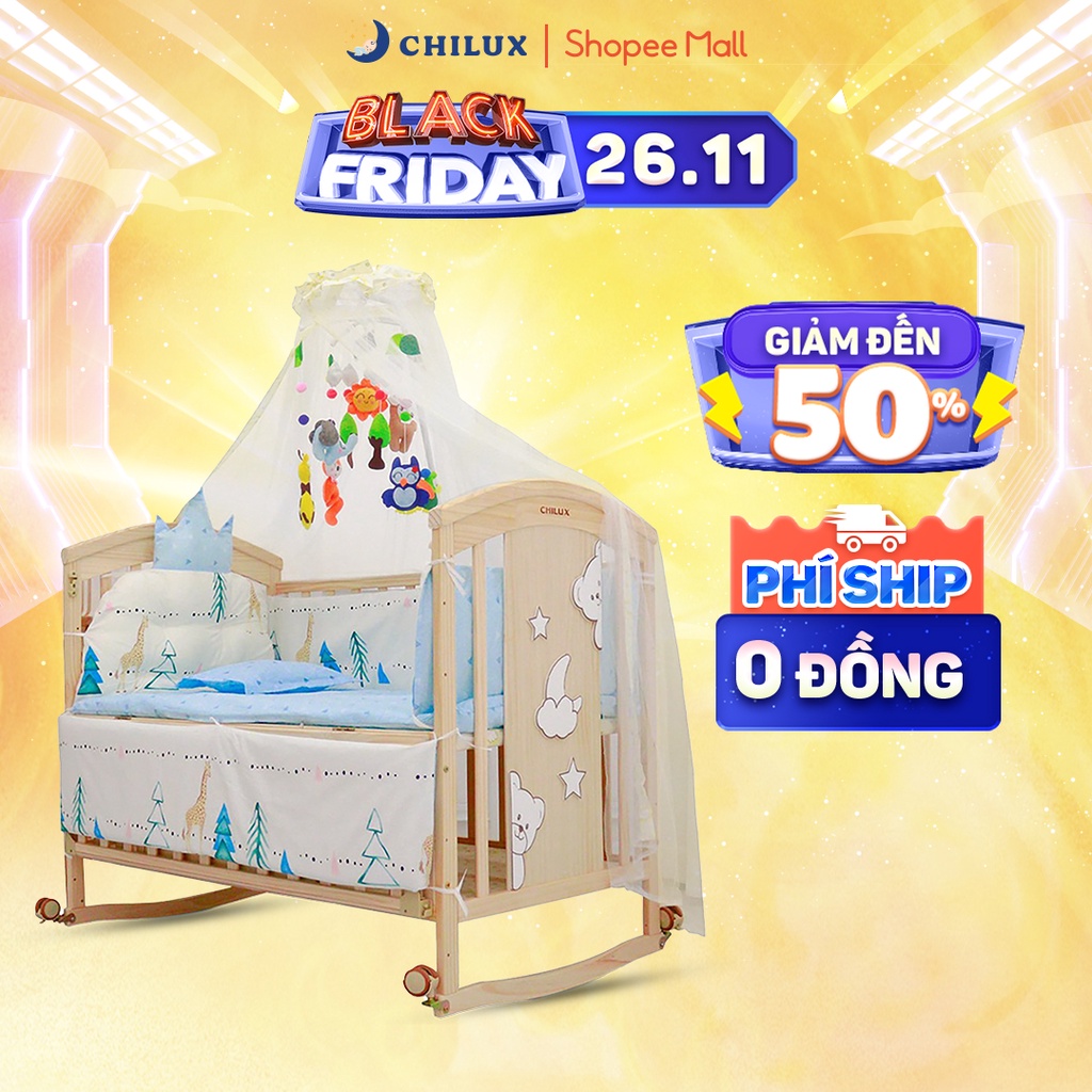 Cũi cho em bé Chilux đa năng kèm bộ quây đệm hoàng gia và đệm xơ dừa - Combo trọn bộ - Tặng kèm mùng chống muỗi free ship